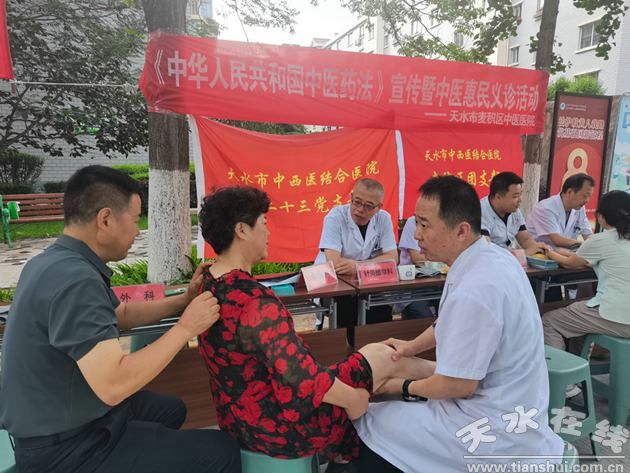 為慶!吨腥A人民共和國中醫(yī)藥法》實施八周年,推動中醫(yī)藥文化深入基層,7月13日,麥積區(qū)中醫(yī)醫(yī)院(市二院南院區(qū))第23黨支部帶領(lǐng)團支部組織內(nèi)科、骨傷科、老年病科、針灸推拿科、風(fēng)濕病科等科室資深專家團隊走進潤天家園小區(qū)開展“《中醫(yī)藥法》宣傳暨中醫(yī)惠民義診”活動,為社區(qū)居民群眾帶來一場融合法治宣傳與特色健康服務(wù)的暖心體驗。