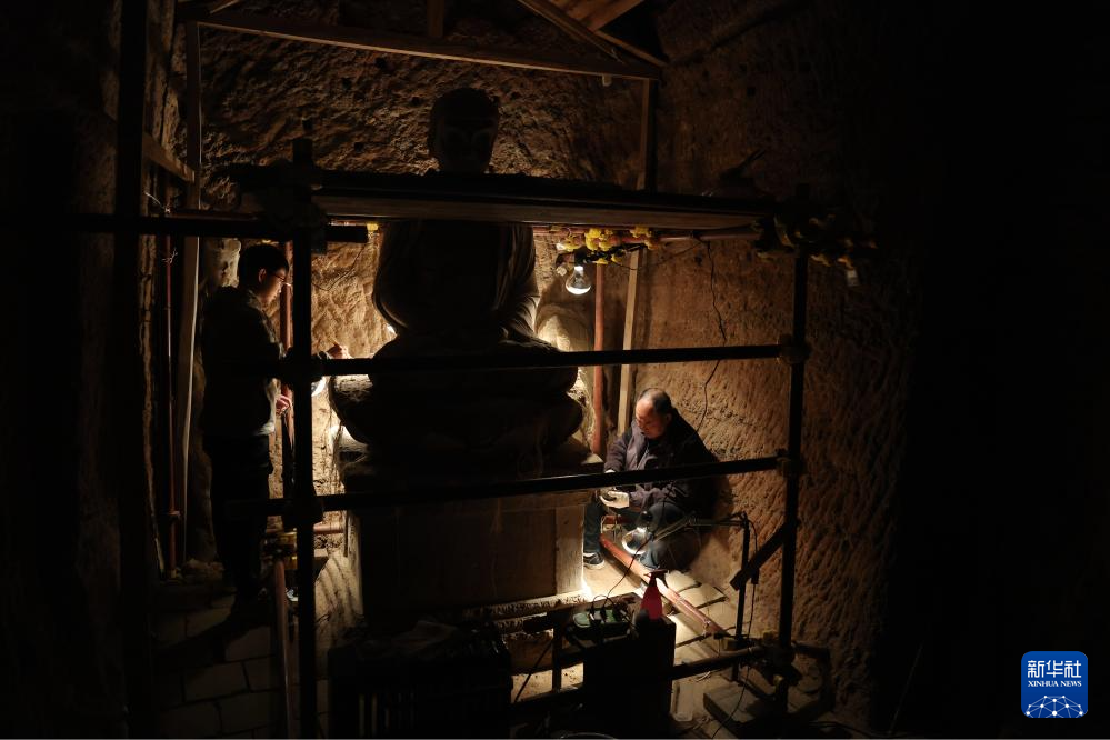 牟常有(右)和徒弟何舉在麥積山石窟133窟內(nèi)修復(fù)塑像(2024年11月2日攝)。