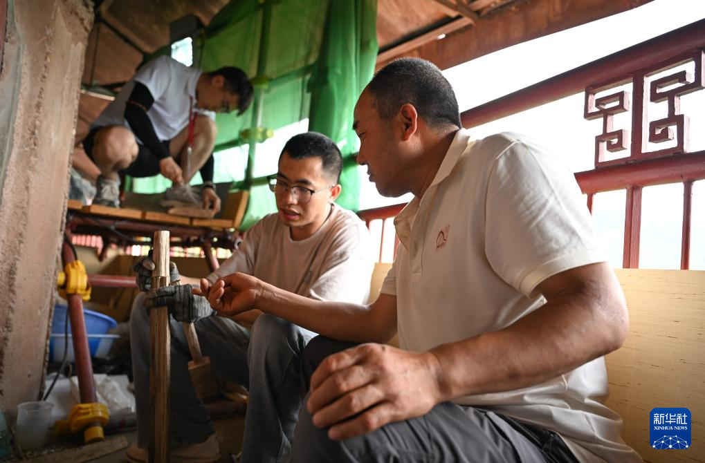 牟常有(右)在正在修復(fù)的麥積山石窟157窟前指導(dǎo)徒弟李浩亮搭建用于文物修復(fù)的木骨架(7月16日攝)。