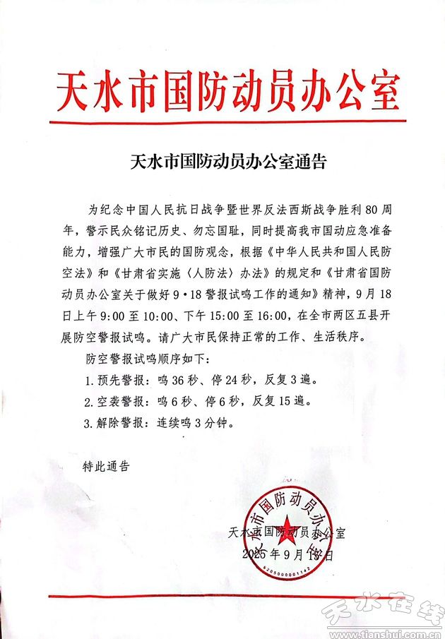 為紀(jì)念中國(guó)人民抗日戰(zhàn)爭(zhēng)暨世界反法西斯戰(zhàn)爭(zhēng)勝利80周年,警示民眾銘記歷史、勿忘國(guó)恥,同時(shí)提高我市國(guó)動(dòng)應(yīng)急準(zhǔn)備能力,增強(qiáng)廣大市民的國(guó)防觀念,根據(jù)《中華人民共和國(guó)人民防空法》和《甘肅省實(shí)施〈人防法〉辦法》的規(guī)定和《甘肅省國(guó)防動(dòng)員辦公室關(guān)于做好9·18警報(bào)試?guó)Q工作的通知》精神,9月18日上午9:00至10:00、下午15:00至16:00,在全市兩區(qū)五縣開展防空警報(bào)試?guó)Q。請(qǐng)廣大市民保持正常的工作、生活秩序。