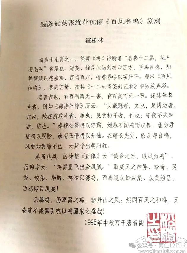 ▲霍松林:《題陳冠英張維萍伉儷<百鳳和鳴>篆刻》(即該書序言)