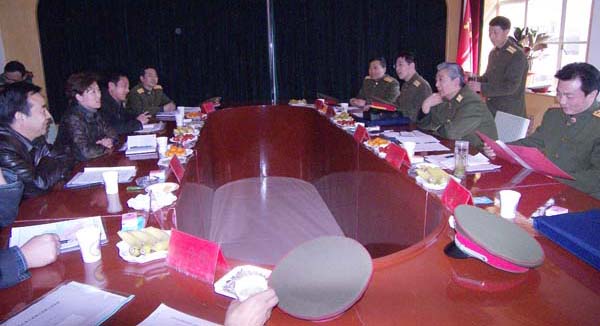 武山縣委書記溫利平、人武部長(zhǎng)王倉和向樊副政委介紹人武部基礎(chǔ)建設(shè)情況