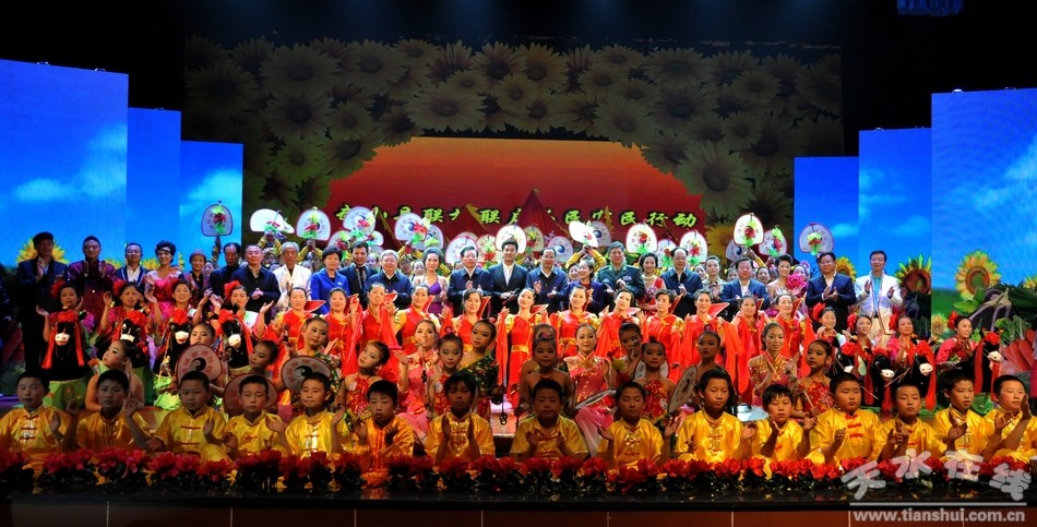參加全省“雙聯(lián)”行動武山現(xiàn)場會的省政協(xié)主席馮健身,省委副書記歐陽堅,省委常委、常務(wù)副省長劉永富,省委常委、副省長咸輝,省委常委、省紀委書記張曉蘭,省委常委、省軍區(qū)政委傅傳玉等省領(lǐng)導和馬世忠、王銳、楊維俊等市領(lǐng)導觀看演出,并上臺與演職人員合影留念。