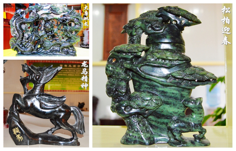 “葡萄美酒夜光杯,欲飲琵琶馬上催,醉臥沙場君莫笑,古來征戰(zhàn)幾人回”。唐朝邊塞詩人王翰這首千古絕唱中,贊譽(yù)的就是鴛鴦?dòng)褚构獗。鴛鴦?dòng)裼置呒y石玉,是指產(chǎn)于甘肅武山縣鴛鴦鎮(zhèn)一帶的超基性巖石,屬年青碧玉的一種。玉無名,遂以鎮(zhèn)名,便叫鴛鴦?dòng),主要分布在山丹鄉(xiāng)邱家峽礦點(diǎn)和廟兒灣礦點(diǎn)。其色澤呈翠綠、墨綠、橄欖綠、瑩光淡綠等多種,暗映天然紋理,恰似龍舞動(dòng),霓虹繚繞,十分典雅,質(zhì)地細(xì)膩堅(jiān)韌、光澤晶瑩、意境無窮,是玉中佳品。