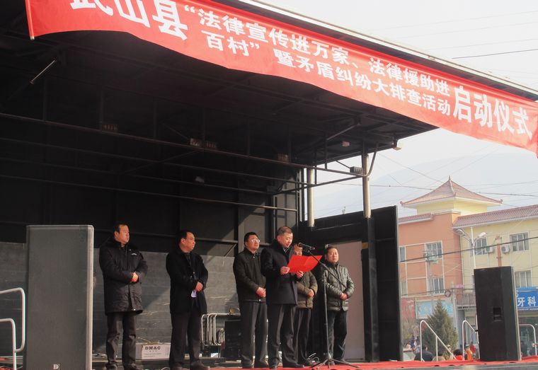 1月27日,武山縣“法律宣傳進萬家、法律援助進百村”暨矛盾糾紛大排查活動在鴛鴦鎮(zhèn)中心廣場舉行?h司法、法院、公安、安監(jiān)、食藥監(jiān)、執(zhí)法、國土、環(huán)保、運管、消防、宣傳等部門及鴛鴦鎮(zhèn)干部群眾共計300余人參加了活動,縣委常委、縣紀委書記張仲牛出席并作講話。