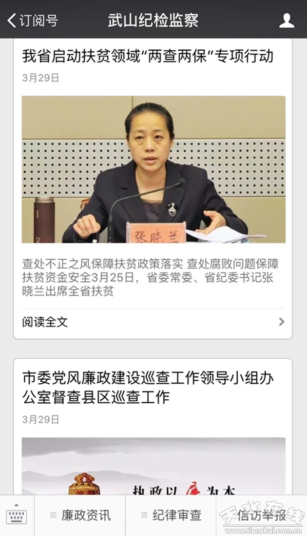 武山縣紀(jì)委將通過微信公眾平臺(tái),綜合運(yùn)用文字、圖片、視頻等多種形式,及時(shí)發(fā)布中央、省、市、縣紀(jì)檢監(jiān)察工作動(dòng)態(tài),積極宣傳黨風(fēng)廉政建設(shè)方面的政策法規(guī),傳遞反腐倡廉“正能量”,為全縣黨風(fēng)廉政建設(shè)和反腐敗工作營造濃厚的輿論氛圍。同時(shí),微信公眾平臺(tái)設(shè)有信訪舉報(bào)欄目,公布了舉報(bào)方式,積極回應(yīng)社會(huì)關(guān)切。(劉子林)