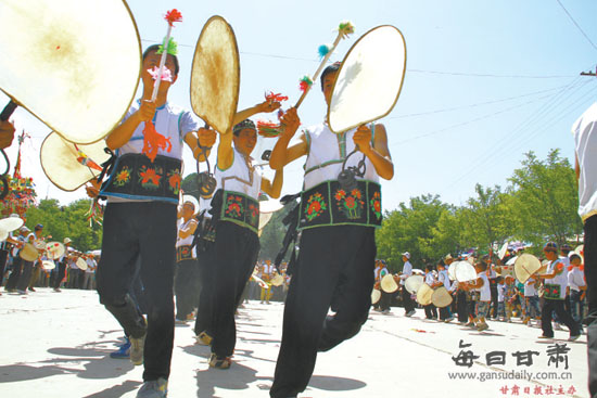 我們又見到了老熟人代斯賢,他的精神完全處在一種過節(jié)的亢奮狀態(tài),記者問他旋鼓舞的“旋”有什么說頭嗎?他這樣解釋,“旋”就是敲鼓的意思,在武術(shù)里有南拳北腿的說法,在武山旋鼓舞也可細分為北部川區(qū)和南部山區(qū)兩大流派。北部川區(qū)旋鼓舞的特點是先“攛神”,有“司公子”、“跳大神”,然后鼓手們組隊形圍火堆而“旋”;南部山區(qū)旋鼓舞的特點是在曠野山地的“旋”,沿著崎嶇山道,蛇行蜿蜒,鼓聲回旋。當然武山旋鼓舞盡管各村都有,但以灘歌鎮(zhèn)最為盛大,連灘歌的得名都與此有關,灘歌古時候不是為羌人對歌的“歌灘”嗎,所以此地便有了這樣牧歌氣息濃厚的詩意名字:灘歌。