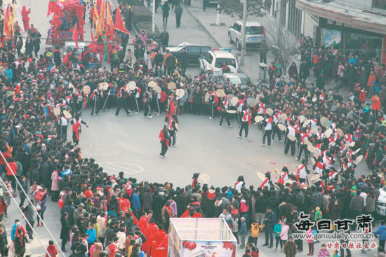 場上旋鼓舞的表演者靈活自如,有收有放,張弛有序,輕重和諧,快慢相襯,兼有變化多樣的手腳技巧和進退有變,緩急相間,群而不亂,合而不板的列隊特色,讓記者想到春節(jié)時從蘭州街頭見到的太平鼓的表演隊,同樣法度謹嚴又不失變化多端,有異曲同工之妙。