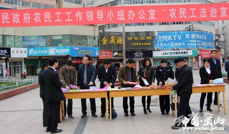 為進(jìn)一步幫助全縣農(nóng)民工更好地了解、熟悉有關(guān)法規(guī)政策,增強(qiáng)法治觀念,提高依法維權(quán)能力,努力營(yíng)造全縣全面建成小康社會(huì)的良好法治環(huán)境,近日,武山縣人民政府農(nóng)民工工作領(lǐng)導(dǎo)小組辦公室成員單位(縣人社局、縣司法局、縣工會(huì)、縣婦聯(lián)、團(tuán)縣委、縣勞務(wù)辦)在縣城寧遠(yuǎn)廣場(chǎng)開(kāi)展了以“增強(qiáng)農(nóng)民工法治意識(shí)、維護(hù)農(nóng)民工合法權(quán)益”為主題的“農(nóng)民工法治宣傳教育日”活動(dòng)?h電視臺(tái)、縣廣播電臺(tái)開(kāi)辦了專題節(jié)目,將連續(xù)播報(bào)一周。