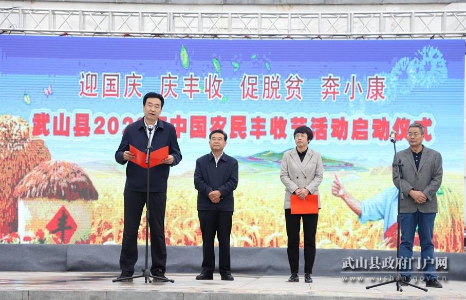 副縣長(zhǎng)令軍強(qiáng)在啟動(dòng)儀式上致辭說(shuō),今年以來(lái),面對(duì)脫貧攻堅(jiān)收官和抗擊新冠肺炎疫情兩場(chǎng)硬仗,武山縣委、縣政府深入貫徹習(xí)近平總書(shū)記關(guān)于“三農(nóng)”工作的重要論述,全面落實(shí)中央和省、市關(guān)于做好 “六穩(wěn)”“六!惫ぷ鞯牟渴鹨,堅(jiān)持防疫情保春耕,不誤農(nóng)時(shí)抓生產(chǎn),努力把疫情對(duì)農(nóng)業(yè)生產(chǎn)的影響降到了最低,有力保障了農(nóng)業(yè)增產(chǎn)、農(nóng)民增收,糧食、蔬菜、果品、畜禽均呈現(xiàn)穩(wěn)定增收的喜人局面。希望全縣上下以這次豐收節(jié)慶;顒(dòng)為契機(jī),進(jìn)一步營(yíng)造關(guān)注農(nóng)業(yè)、關(guān)心農(nóng)村、關(guān)愛(ài)農(nóng)民的濃厚氛圍,全力打贏脫貧攻堅(jiān)收官戰(zhàn),深入實(shí)施鄉(xiāng)村振興戰(zhàn)略,奮力譜寫(xiě)“農(nóng)業(yè)強(qiáng)、農(nóng)村美、農(nóng)民富”的武山篇章。