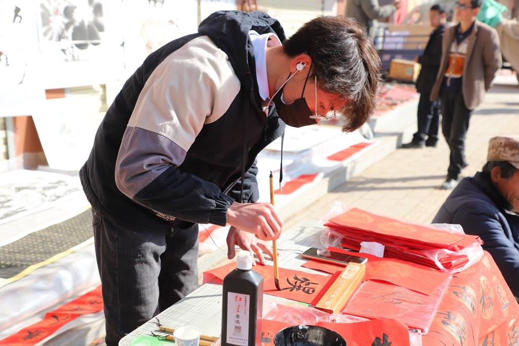 在一個(gè)寫春聯(lián)的攤點(diǎn),大學(xué)生盧世清正在書寫著贊美美好生活的對(duì)聯(lián)。今年大一的他學(xué)的是書法專業(yè),他告訴記者,擺攤子寫對(duì)聯(lián)一方面想掙點(diǎn)零花錢,另一方面也是一個(gè)社會(huì)實(shí)踐。
