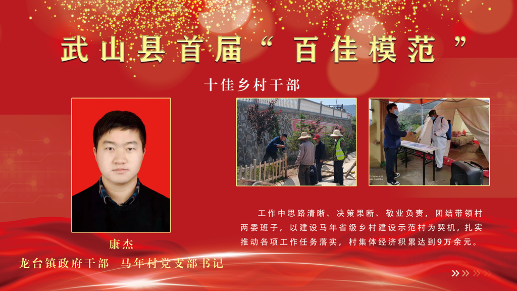 康杰,龍臺(tái)鎮(zhèn)干部、馬年村黨支部書記。工作中思路清晰、決策果斷、敬業(yè)負(fù)責(zé),團(tuán)結(jié)帶領(lǐng)村兩委班子,以建設(shè)馬年省級(jí)鄉(xiāng)村建設(shè)示范村為契機(jī),扎實(shí)推動(dòng)各項(xiàng)工作任務(wù)落實(shí),村集體經(jīng)濟(jì)積累達(dá)到9萬(wàn)余元。