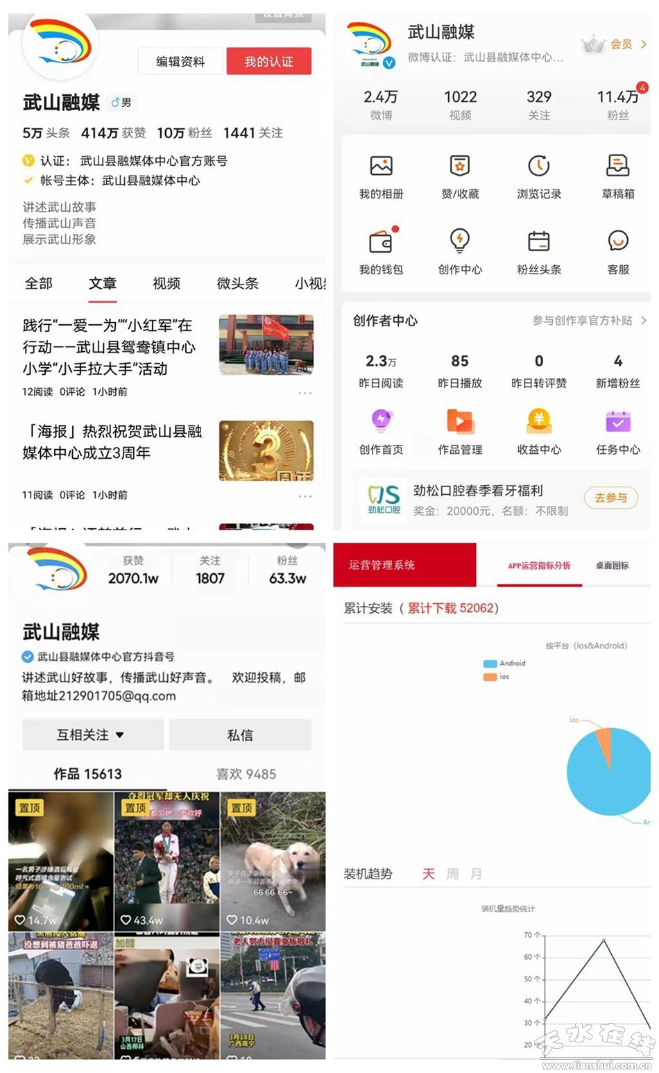 加快融合發(fā)展,武山媒體矢志不渝,一邊探索實(shí)踐,一邊總結(jié)提升。主力軍全面挺進(jìn)主戰(zhàn)場(chǎng),以互聯(lián)網(wǎng)思維優(yōu)化資源配置,努力搶占傳播制高點(diǎn),深耕本土新聞,打造優(yōu)質(zhì)內(nèi)容,實(shí)現(xiàn)了從傳統(tǒng)媒體的“單打獨(dú)斗”到媒體融合的“一體作戰(zhàn)”,中心所屬縣廣播電視臺(tái)、中國(guó)·武山網(wǎng)、“新武山”APP、武山發(fā)布和武山融媒公眾號(hào)、武山融媒抖音號(hào)、快手號(hào)、微博和頭條號(hào)等平臺(tái)聯(lián)合發(fā)力,入駐新華社、央視頻、視聽(tīng)甘肅、新甘肅、新天水等國(guó)家和省市級(jí)平臺(tái),新媒體陣地不斷擴(kuò)大,全媒體矩陣不斷疊加,“武山融媒”的傳播力和影響力不斷增強(qiáng),輿論主陣地不斷提升。經(jīng)第三方平臺(tái)統(tǒng)計(jì),2021年新武山客戶端下載量達(dá)5.1萬(wàn)人次,占常駐人口數(shù)的15%;各平臺(tái)發(fā)稿數(shù)12萬(wàn)余條,總閱讀量超過(guò)3億人次,傳播力效應(yīng)顯著增強(qiáng);武山融媒抖音號(hào)粉數(shù)達(dá)63.4萬(wàn),獲贊2070萬(wàn),武山融媒微博粉絲量近12萬(wàn),獲贊2萬(wàn)多,武山融媒頭條號(hào)粉絲數(shù)8.6萬(wàn),獲贊370萬(wàn),新華號(hào)閱讀量百萬(wàn)以上作品45余部,在2021年全省縣級(jí)融媒體傳播力排名中位列全省第7名,2021年5月,獲全省縣級(jí)融媒體中心優(yōu)秀融合案例“融合傳播獎(jiǎng)”。
