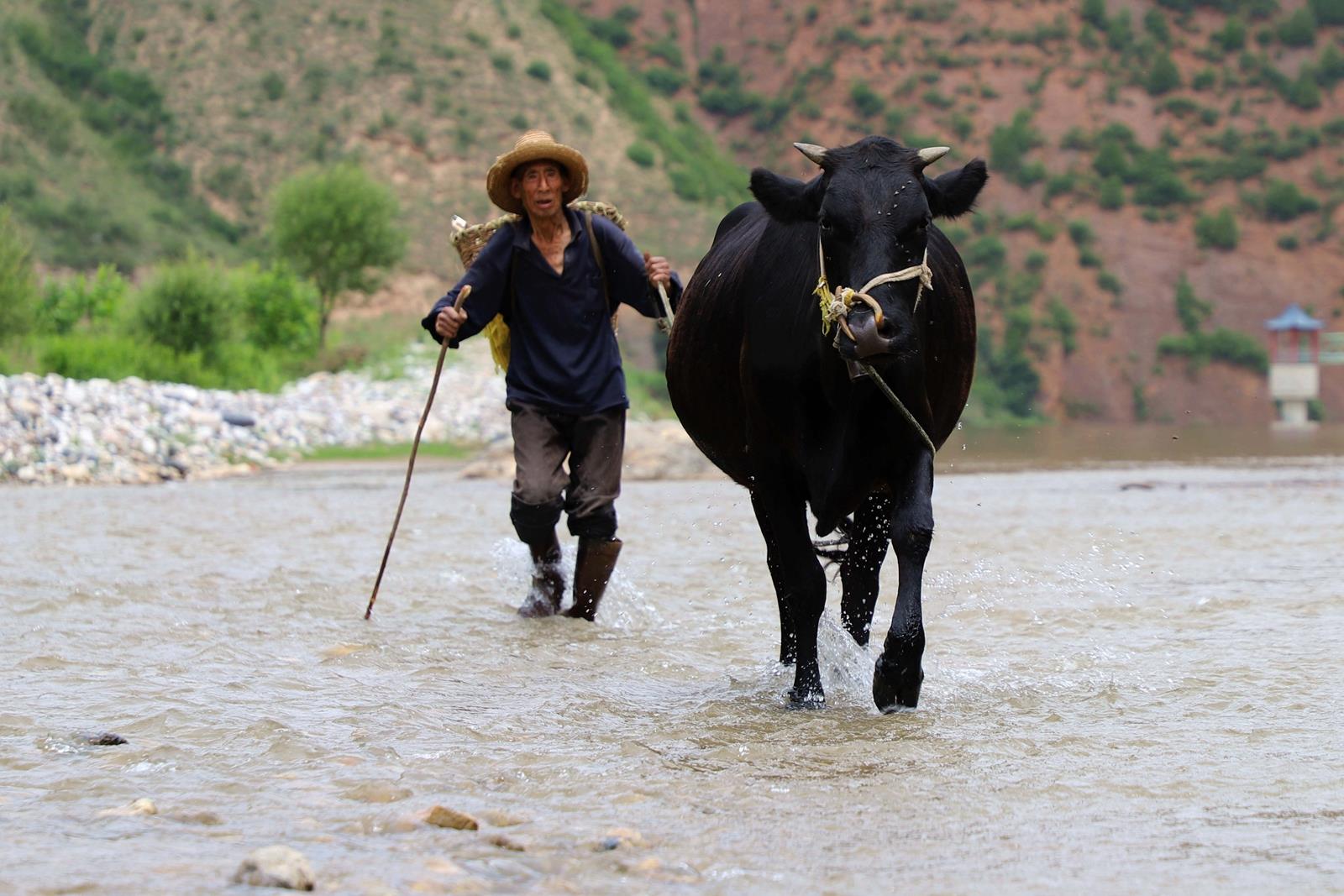 (榜沙河南陽(yáng)段水流平緩村民趕牛過(guò)河)