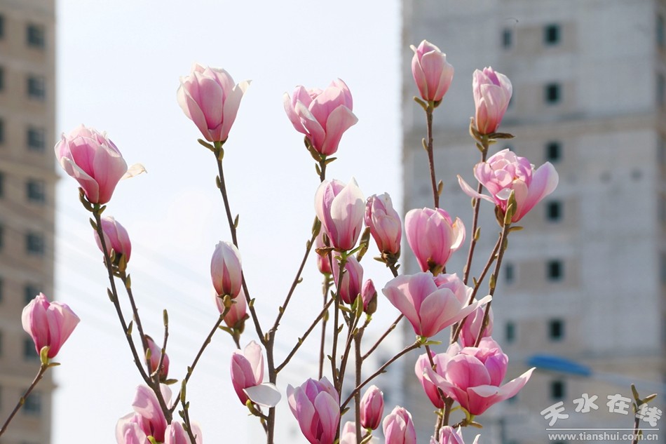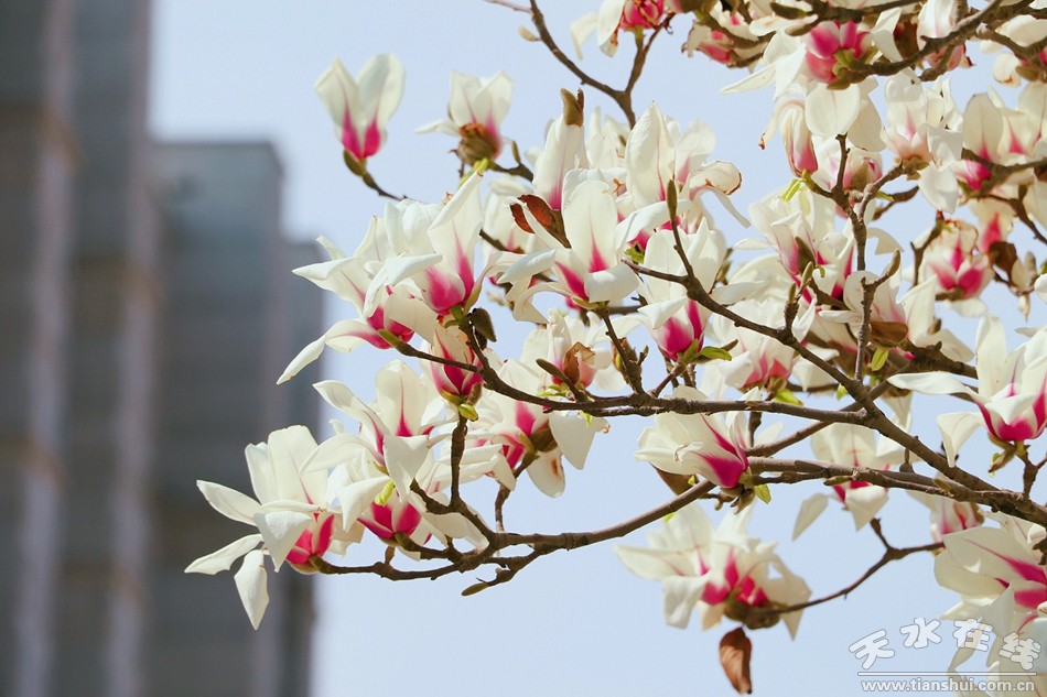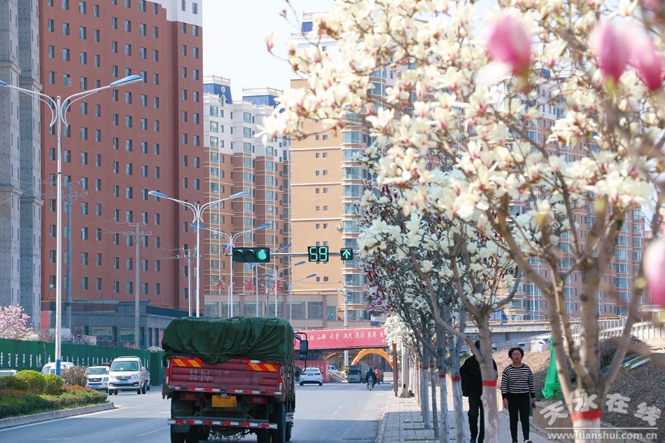 四月的武山是溫柔的,沿著渭河一路向東,在洛門,與一排玉蘭遇見,粉的可愛,白的純潔,在藍天白云之下,斑駁在地上的影子都是美好的,站在橋上望去,玉蘭花隨著公路一直延伸到天邊,車流中,高樓下,盡顯多姿嫵媚。