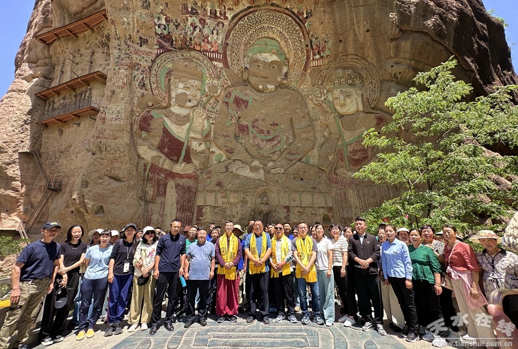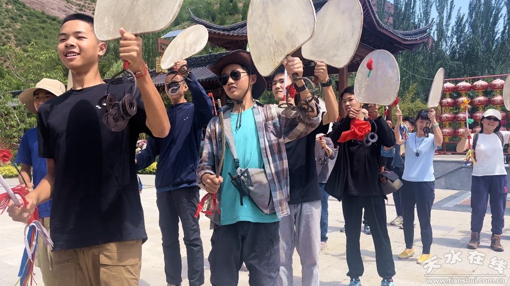 研學(xué)團(tuán)在水簾洞景區(qū)親身體驗(yàn)了國(guó)家級(jí)非物質(zhì)文化遺產(chǎn)保護(hù)項(xiàng)目武山旋鼓舞和搗蒜罐。看到世界第一摩崖大佛拉梢寺后,同學(xué)們無(wú)不為“十有武山祈福圣地”的奇山秀水和深厚文化所震撼,對(duì)世界第一摩崖大佛和拉梢寺雄渾瑰麗的壁畫彩塑和浮雕大為贊賞。