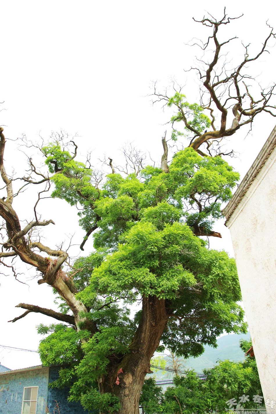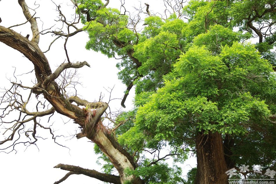 走近這棵古槐,最為震撼的便是它“枯榮共生”的奇特景象。粗壯的樹干上,一邊是郁郁蔥蔥的綠葉,在陽光的照耀下閃爍著生機與活力,那層層疊疊的翠綠,仿佛在訴說著生命的蓬勃與熱烈;而另一邊,則是干枯的枝丫,扭曲而滄桑,它們在時光的侵蝕下失去了翠綠的衣裳,只剩下嶙峋的輪廓,似在默默追憶往昔歲月。一邊是新生命的不斷萌發(fā),一邊是舊時光的沉沉落幕,綠葉與枯枝形成了強烈的視覺對比,既讓人感受到生命的頑強不息,又讓人感慨歲月的無情流逝。
