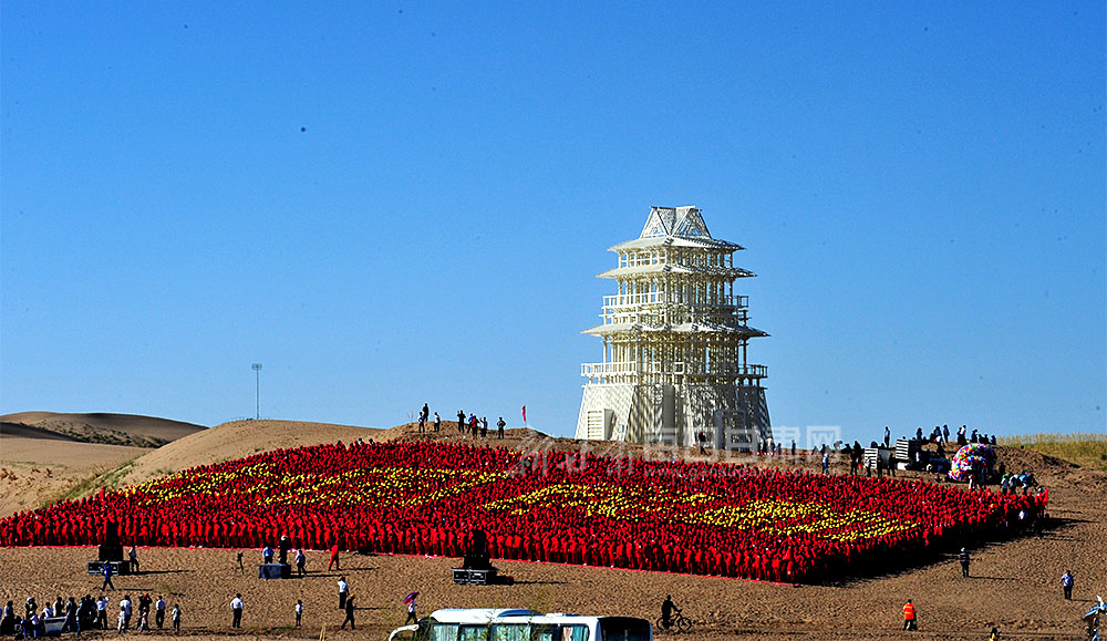 開(kāi)幕式現(xiàn)場(chǎng),民勤縣為入展藝術(shù)家頒發(fā)了收藏證書,參展藝術(shù)家留下手印。民勤縣近萬(wàn)名志愿者站成國(guó)旗隊(duì)形,齊唱《我和我的祖國(guó)》,排列成醒目的“中國(guó)•民勤”字樣,他們渾厚高亢的歌聲將現(xiàn)場(chǎng)氣氛推向高潮。