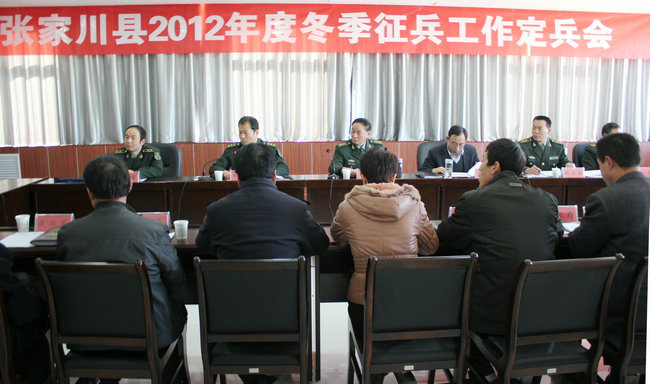 2012年12月5日,張家川回族自治縣在縣人武部會(huì)議室召開2012年冬季征兵工作定兵會(huì),天水市軍分區(qū)副司令員張瑜出席會(huì)議并作重要講話,張家川縣政府縣長(zhǎng)馬中奇、縣委常委、人武部長(zhǎng)司健吾及縣公安、教育、人社、民政、團(tuán)委、婦聯(lián)、衛(wèi)生及全縣15個(gè)鄉(xiāng)鎮(zhèn)武裝部長(zhǎng)參加了會(huì)議。