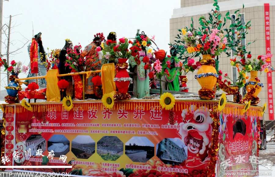 此次社火表演既有傳統(tǒng)的踩高蹺、耍獅子、打拳、彩車,又有陣容強(qiáng)大的秧歌隊(duì),形式多種多樣,內(nèi)容豐富多彩。有的宣傳黨的好政策,有的弘揚(yáng)社會(huì)主義核心價(jià)值觀,有的傳播傳統(tǒng)文化,有的以歷史人物或故事為題材。參與社火表演的演員有老有少,老奶奶們畫個(gè)大花臉,穿上花衣裳,刁上煙鍋?zhàn),走的精神抖擻,喜笑顏開(kāi);成群結(jié)隊(duì)的孩子打鼓的、踩高蹺,玩的不亦樂(lè)乎。