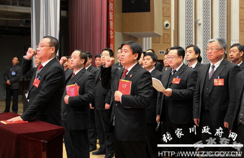 “我宣誓:忠于中華人民共和國憲法,維護憲法權(quán)威,履行法定職責(zé)……”2月22日下午,一句句鏗鏘有力的聲音在張家川回族自治縣影視中心會場響起。在張家川縣十五屆人大五次會議第三次大會上新當(dāng)選的縣人民政府縣長馬筱寧、縣人大常委會副主任王璟、縣法院院長黎平生一同向憲法宣誓。