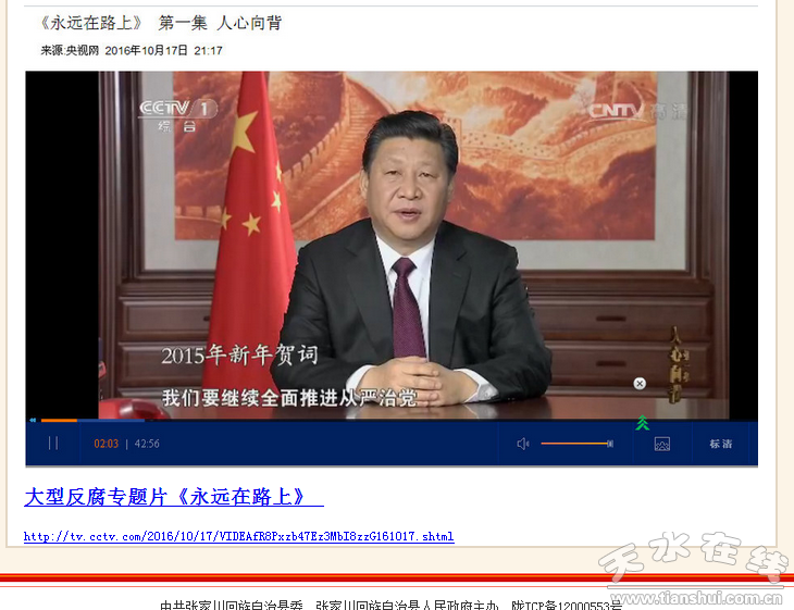 近日,由中紀委宣傳部、中央電視臺聯(lián)合制作的大型專題片《永遠在路上》在央視播出。為進一步增強警示教育作用,11月7日,張家川縣委發(fā)出倡議,號召全縣黨政機關干部積極主動收看電視專題片《永遠在路上》。即日起,縣電視臺和縣政府網站將連續(xù)轉播、轉載央視網8集電視專題片《永遠在路上》。