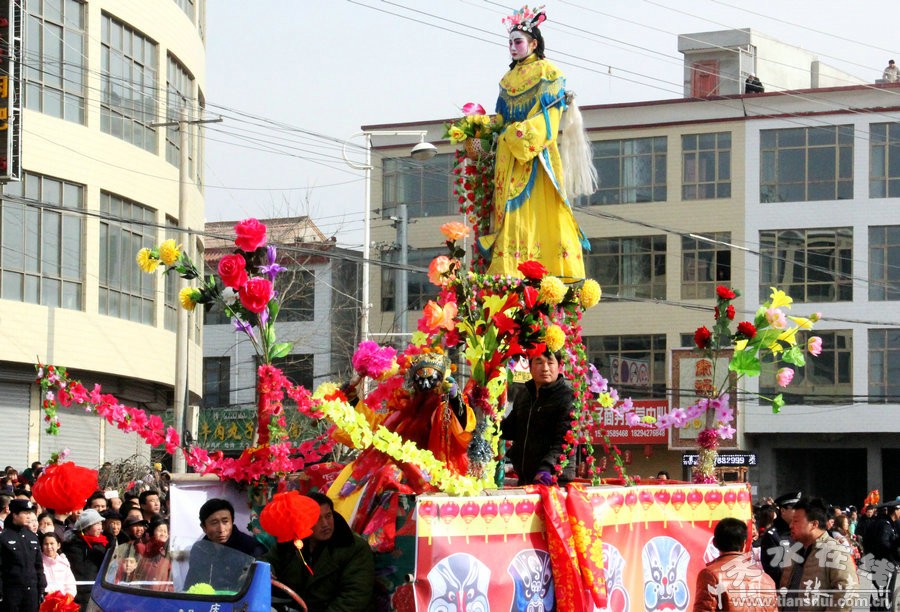 一大早,盡管天氣寒冷,但群眾早已將縣城大小街道圍得水泄不通。龍舞、獅舞、腰鼓、太平鼓、花車(chē)、高蹺等各種社火表演,帶來(lái)多種文化蘊(yùn)意,帶給群眾無(wú)限歡喜?h直單位的花車(chē),美工精致、主題突出;農(nóng)村的舞龍、舞獅社火別出心裁,讓人賞心悅目,吸引著上萬(wàn)回漢群眾的眼球。