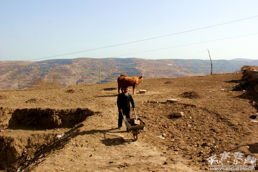 站在村委會的大門,遠(yuǎn)望出去,座座山梁,梯田層層,依山旁溝。綿延如帶的層層片片梯田地,隱約還能看到勤勞的莊稼漢拉著牛車在運(yùn)肥,整理土地,一幅人勤春早的圖像。