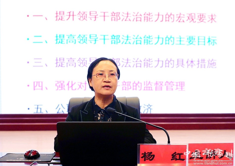 培訓(xùn)班上,楊紅圍繞提高領(lǐng)導(dǎo)干部法治能力的宏觀要求、主要目標(biāo)、具體措施以及強(qiáng)化對領(lǐng)導(dǎo)干部的監(jiān)督管理、公職人員的權(quán)利救濟(jì)5個方面,旁證博引、言簡意賅、通俗易懂地為大家進(jìn)行了授課,對于不斷提高行政執(zhí)法人員特別是領(lǐng)導(dǎo)干部依法行政理念和能力,不斷創(chuàng)新社會管理方式,推動法治政府建設(shè)具有重大意義。