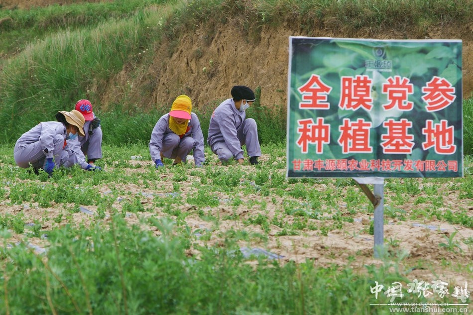 在連五鄉(xiāng)全膜黨參種植基地,移植的黨參苗郁郁蔥蔥,苗高已有6-10厘米,村民正忙著鋤草。