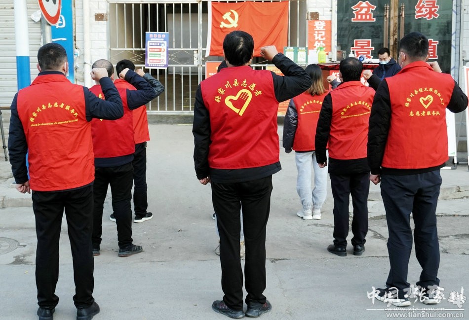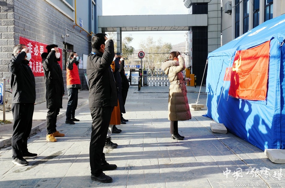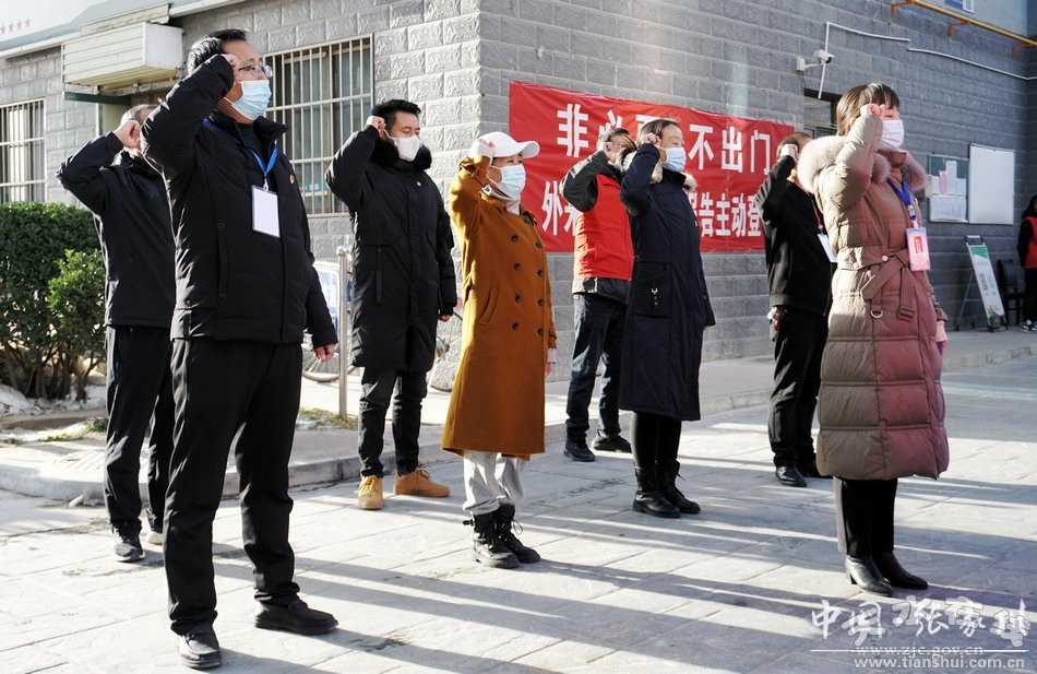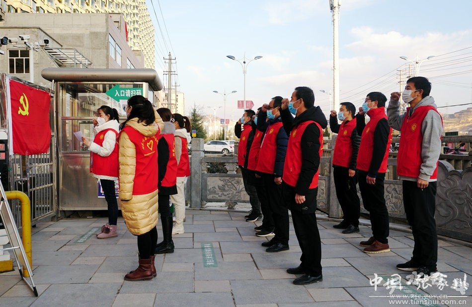 11月8日,張家川縣金都小區(qū)疫情監(jiān)測點,在小區(qū)功能型黨支部書記馬麗的帶領(lǐng)下,黨員們隊列整齊,莊重地舉起右手,直面黨旗,重溫入黨誓詞。