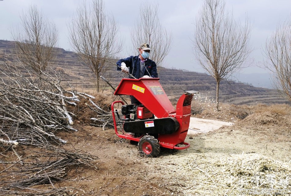在采訪中,記者注意到,花椒地里一臺嶄新的碎枝機不停運轉(zhuǎn),社員們把修剪下來的花椒樹枝加入碎枝機中,吐出來一堆堆的碎木屑。