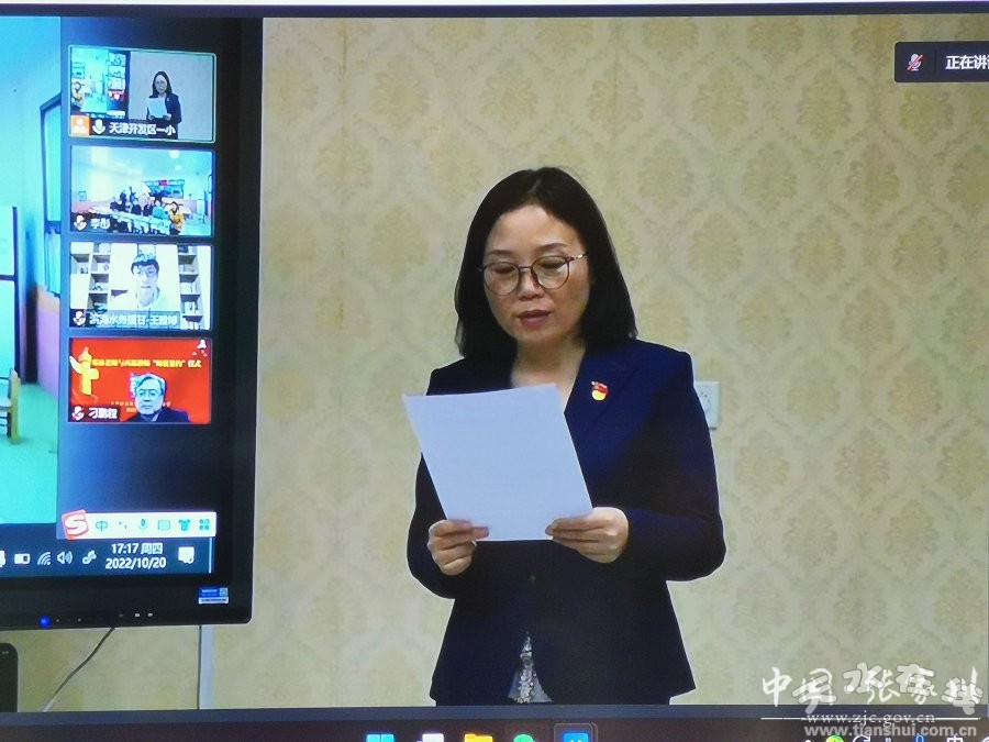 下午5時,儀式正式開始,天津經濟技術開發(fā)區(qū)第一小學校長劉麗莉及學校中層干部、鄧冰老師和張家川縣張川學區(qū)校長馬玉忠,堡山小學的馬志林、李彤、王鑫、李海紅4名老師通過視頻會議連線。中煤地質總局干部刁鵬程致辭,堡山小學教師代表宣讀“拜師申請書”,開發(fā)區(qū)第一小學主任時玉權宣讀《開發(fā)區(qū)第一小學關于鄧冰老師與西部教師建立師徒關系的決定》,師徒簽訂《東西部教育協(xié)作師徒協(xié)議書》,劉麗莉向鄧冰老師頒發(fā)《指導教師聘書》,堡山小學的4名教師向鄧冰老師行拜師禮,她們通過視頻會議進行云合影,并在鄧冰老師帶領下宣誓《人民教師誓詞》,鄧冰老師和堡山小學教師分別表態(tài)發(fā)言。