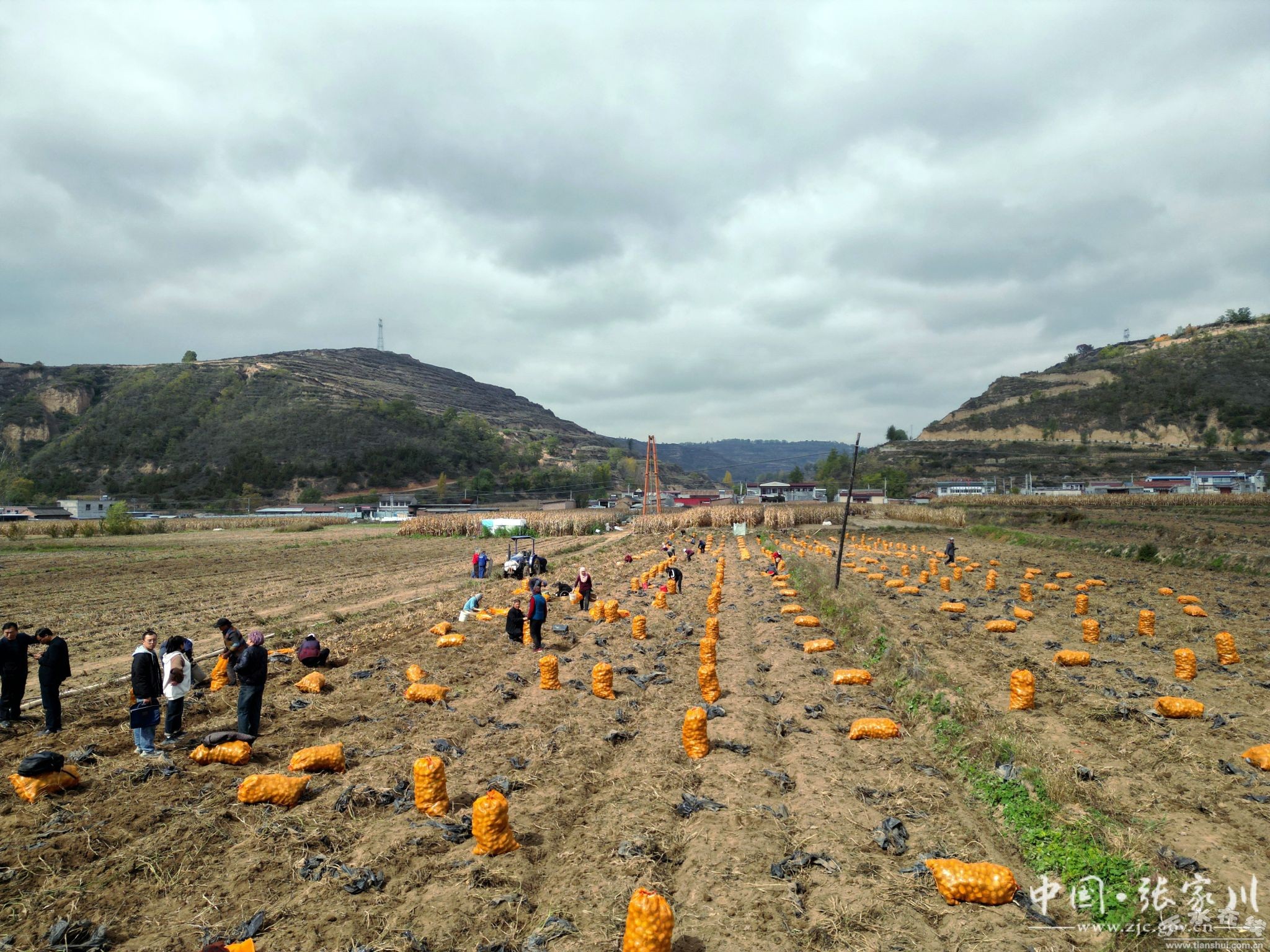 天水中谷農(nóng)業(yè)發(fā)展有限公司位于張家川鎮(zhèn)劉家村的馬鈴薯原原種繁育基地,200多畝馬鈴薯也進(jìn)入收獲期,公司負(fù)責(zé)人張小平和附近農(nóng)戶正忙碌在田間,伴隨著馬鈴薯收獲機(jī)來(lái)回翻地作業(yè),個(gè)大、皮薄、色鮮的優(yōu)質(zhì)馬鈴薯被飛快地翻出了土壤,成排鋪在地面,村民們忙著撿拾、裝袋。一筐筐、一袋袋的馬鈴薯整齊地碼放在田間,田間地頭充滿豐收的喜悅。