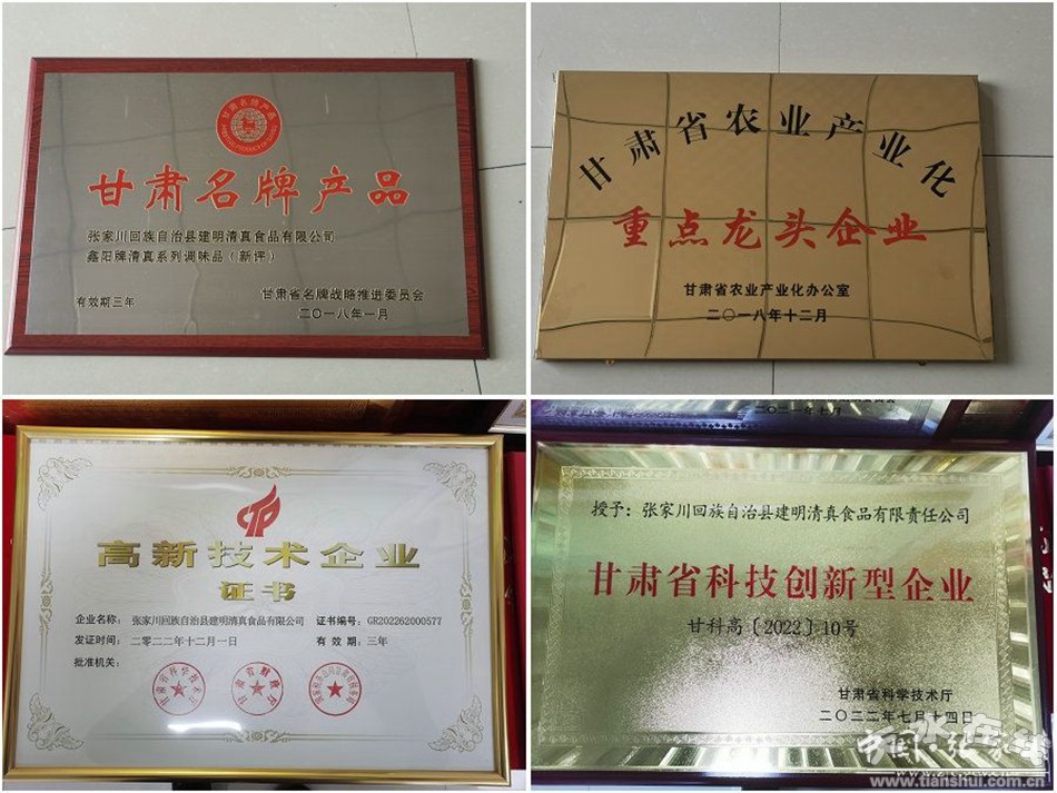 經(jīng)過(guò)父子兩代人的努力,公司先后獲得“老百姓信得過(guò)清真品牌企業(yè)”,“清真調(diào)味品十大影響品牌企業(yè)”、“中國(guó)誠(chéng)信民營(yíng)企業(yè)”及“甘肅名牌產(chǎn)品”、“甘肅農(nóng)業(yè)產(chǎn)業(yè)化重點(diǎn)龍頭企業(yè)”、“甘肅省科技創(chuàng)新型企業(yè)”、“高新技術(shù)企業(yè)”等榮譽(yù)稱(chēng)號(hào),縣建明清真食品有限公司黨支部榮獲“先進(jìn)基層黨支部”、“示范黨組織”稱(chēng)號(hào)。公司曾被縣委、縣政府授予“納稅先進(jìn)企業(yè)”,多次被相關(guān)部門(mén)授予誠(chéng)信企業(yè)、消費(fèi)者信得過(guò)企業(yè),被省民委、省財(cái)政廳等部門(mén)確定為少數(shù)民族特需商品定點(diǎn)生產(chǎn)企業(yè)。