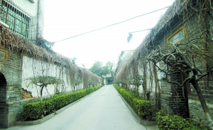 進(jìn)大門(mén),眼前是一條不太長(zhǎng)的小巷,巷子兩側(cè)墻上滿是爬山虎的枝葉。雖然剛剛進(jìn)入初春,但密密麻麻的枝葉,讓我們能想象它們?cè)谙奶焓侨绾蔚拿;墻角下長(zhǎng)著很旺盛的冬青,散發(fā)著綠色,巷子盡頭有一株異常粗壯的槐樹(shù),一座古建筑緊挨著槐樹(shù)而建。
