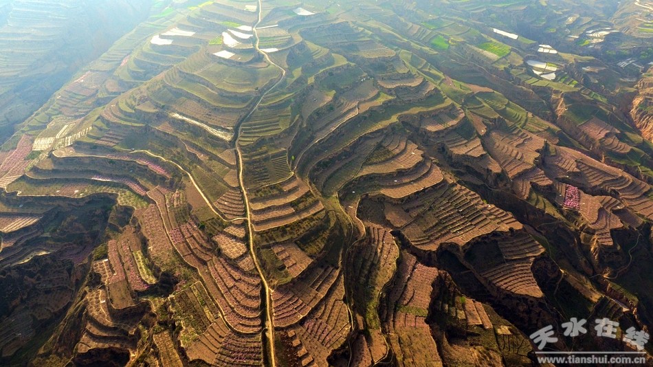 一座座蜿蜒起伏的青山,有情有義,敞開(kāi)寬廣的胸懷,迎接春天的和風(fēng)細(xì)雨。一塊塊錯(cuò)落有致的梯田,有說(shuō)有笑,露出明媚的笑臉,歌唱春天的花紅草綠。有人將梯田媲美長(zhǎng)城,說(shuō)它們都是人類(lèi)創(chuàng)造的奇跡,可不同在于,長(zhǎng)城像是遒勁有力的狂草,一筆覆蓋山川河流,走筆龍蛇;梯田則像是工工整整的小楷,一絲不茍地就著山形變幻著形狀,成為大地之上最美的曲線(xiàn)。如詩(shī)如畫(huà)的梯田景觀裝飾了秦安的春天,猶如一幅不停舒展著的畫(huà)卷,那蜿蜒的曲線(xiàn)便是大自然的杰作。這是一片神奇的土地,那鬼斧神工雕鑿而成的層層梯田,云霧繚繞的山野村莊,自然淳樸的民間風(fēng)情,隨處可定格為一幅絢麗迷人的風(fēng)情畫(huà)。在春日陽(yáng)光的沐浴下,梯田依偎著村舍,村舍里燃起炊煙,炊煙追逐著風(fēng),風(fēng)舞動(dòng)花海,花海上灑滿(mǎn)了陽(yáng)光,一切是那樣的契合,那樣的攝人心魄。你看那遠(yuǎn)處的梯田,如鏈似帶,層疊起伏,高低錯(cuò)落,好像一層層姹紫嫣紅的海浪,從遙遠(yuǎn)的天邊滾滾落下。放眼望去,花田環(huán)抱著大山,一切都分布的井井有條,哪里走路哪里栽樹(shù)、哪里分割哪里合攏,都經(jīng)過(guò)了精心的設(shè)計(jì),讓人不得不感嘆勞動(dòng)人民的智慧。歷經(jīng)千年開(kāi)墾躬耕,始得如今樣貌,秦安的梯田是藏在深山里的閨秀,千百年來(lái),靜靜地躺在大山的懷抱里,而今終于因天水在線(xiàn)的一次航拍,以最質(zhì)樸的容顏,展露在世人面前。