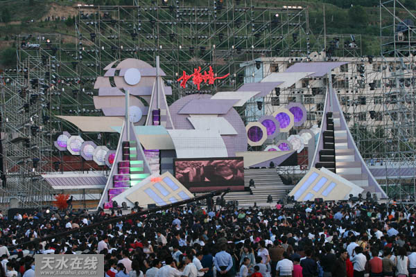 天水在線報道 2007年6月22日晚,千年古城天水在“中華情”的音樂聲中“醉”了。純樸勤勞的天水人民從來沒有近距離地感受過這樣一場震撼人心的音樂“盛宴”。超豪華的舞臺設計、威力十足的火箭炮、騰空升起的焰火、五光十色的舞美燈光令觀眾大開眼界,給當日的公祭伏羲盛典之夜增添了無比歡樂的喜慶氣氛。