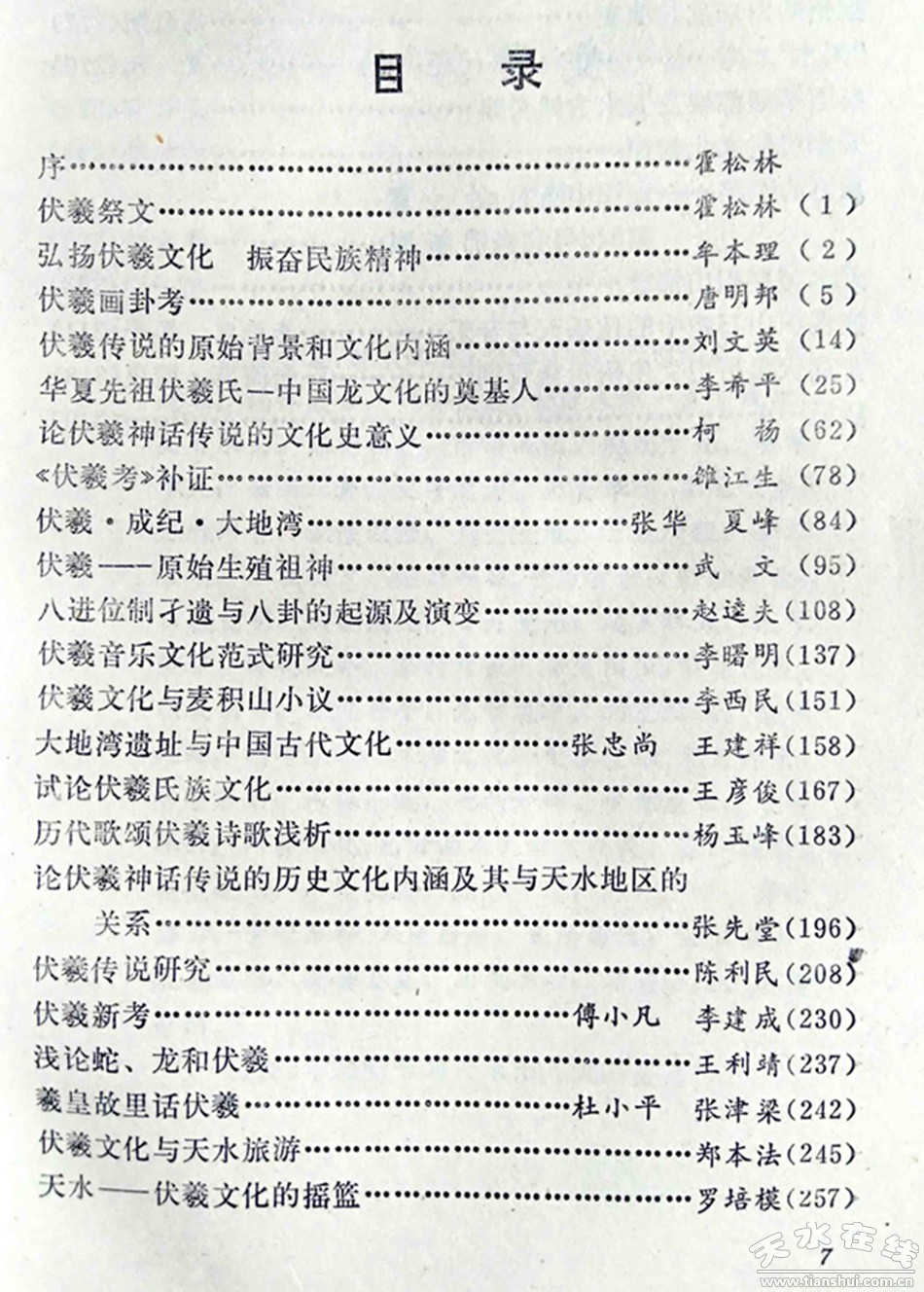 《伏羲文化》一書,副主編有任元融、王世忠、劉建邦、申積來、于國祥、張四龍。收入江澤民主席“伏羲故里”題詞以及彩色照片八幀;天水市人大主任牟本理,武漢大學(xué)哲學(xué)系教授、中國周易研究會會長唐明邦等作者的論文32篇,其中有來自臺灣的學(xué)者薛清泉先生的《首屆伏羲歷史文化研討會賀詞》。此書是改革開放后,天水第一次舉辦全國性伏羲文化研討會的成果集結(jié),也是自上世紀(jì)九十年代始,國內(nèi)外最早研究伏羲文化的一批文獻資料,茲將作者與文章題目摘抄如下:
