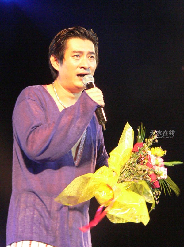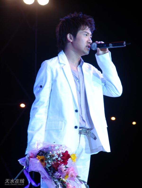 8時(shí)整,在一片歡呼聲中,臺(tái)灣歌手黃安出現(xiàn)在舞臺(tái)上,他的出現(xiàn)立刻受到了天水歌迷的熱烈歡迎,他保持了一貫的幽默和風(fēng)趣。在主持節(jié)目的同時(shí)還不忘說:“這次來天水,我覺得這里山美水美,人更美,我喜歡天水的山山水水,更喜歡天水的美女們!”引得全場觀眾大笑不止。