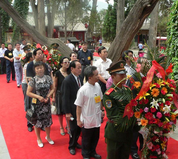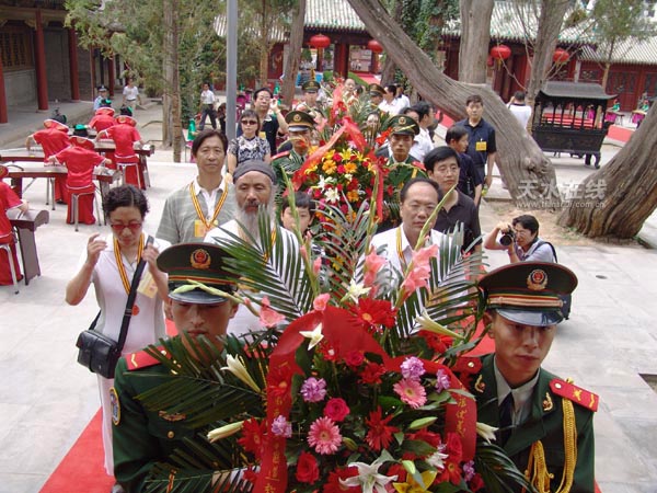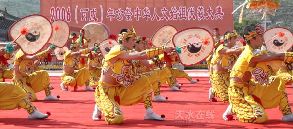 “四海華人仰始祖,一片虔誠祭伏羲”。由甘肅省人民政府主辦,天水市人民政府和甘肅省文化廳承辦的2006年公祭中華人文始祖伏羲大典于7月3日上午9點(diǎn)50分正式開始。鼓聲雄宏,鐘鳴悠遠(yuǎn),34咚鼓聲代表全國34個(gè)省、自治區(qū)和直轄市共祭中華人文始祖,9響鐘鳴傳達(dá)了中華民族傳統(tǒng)的最高禮數(shù),表達(dá)了全體中華兒女對人文始祖伏羲創(chuàng)世功績的緬懷和景仰。