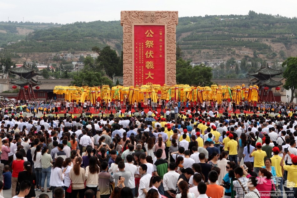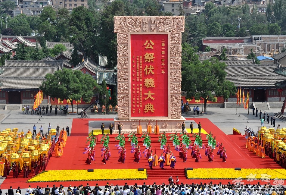 公祭中華人文始祖伏羲大典自1988年由天水市人民政府恢復(fù)主辦。2005年,公祭伏羲大典升格為省級公祭,成為甘肅省的一張重要文化名片,被列入中國百家重點(diǎn)節(jié)慶活動。2006年入選國務(wù)院首批國家級非物質(zhì)文化遺產(chǎn)保護(hù)名錄。 2012年公祭伏羲大典緊緊圍繞華夏文明傳承創(chuàng)新區(qū)建設(shè)和“弘揚(yáng)伏羲文化,打造全球華人尋根祭祖圣地”的目標(biāo),主辦單位上升到國家層面,由國務(wù)院臺灣事務(wù)辦公室、國務(wù)院僑務(wù)辦公室、國務(wù)院港澳事務(wù)辦公室、中國僑聯(lián)和甘肅省人民政府共同主辦。 2014年首次在海峽兩岸同時舉辦了共祭伏羲典禮,擴(kuò)大了兩岸文化交流,增強(qiáng)海峽兩岸同根同祖的民族情結(jié)和民族向心力。